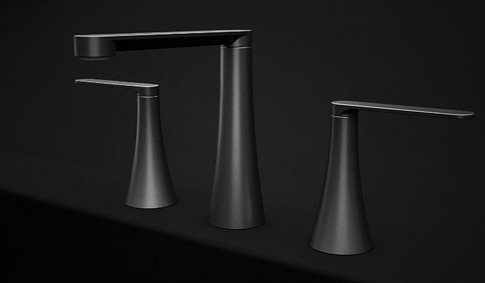 The new Konic Faucet from Franz Viegener is an artful blend of linear and curved features with flared conical bases that taper into attenuated peaks supporting squared fixtures. The slightly rounded tip of the faucet echoes the geometric shape of its base, which is matched in the design of the smooth levers and optional cross handles.