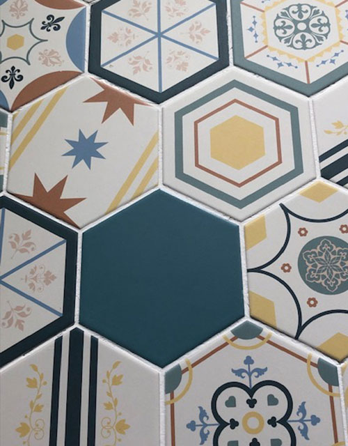 Traditional Made New. Spain – and Europe in general – takes pride in its history through its tile, remaking what was ancient into something modern and trendy. This appeared in traditional ceramic tiles with modern shapes or patterns and also in the prevalence of hand-made tiles at the show. Shown here is Boom from Cevica, a flooring and wall tile that mixed the traditional hexagonal shape with a colorful design inspired by pop art.
