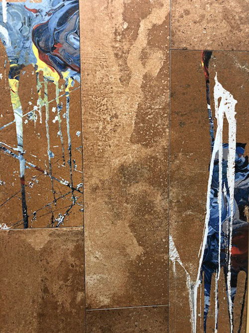 Melting Away. Somewhere between the rock and water inspirations and the more conceptual idea of painting came products with liquid-like patterns. These manufacturers were breaking away from the idea of commonly used surfaces like stone, wood and patterned tile and instead had completely new products totally unlike what we’ve seen before. Shown here is Fire from Apavisa, which combined traditional stone-look tile with a colorful, melting design.