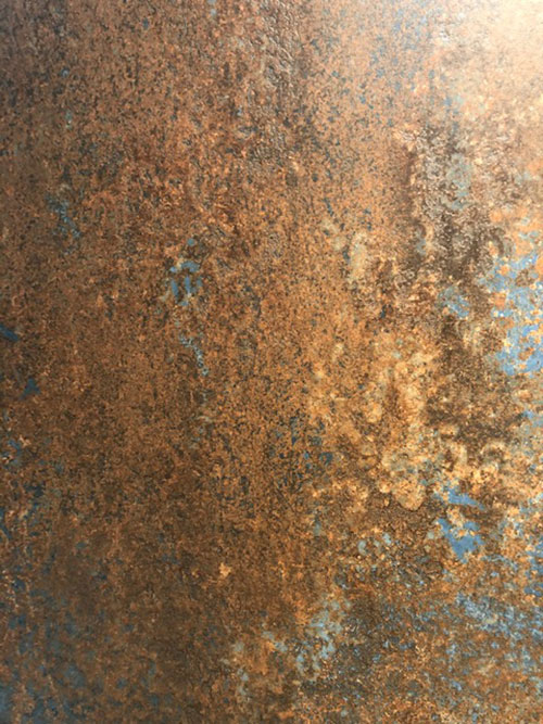 Oxidized Metallics. It’s a given that metallics are big, but a certain type of metal was trending in particular at the show. The weathered look of oxidized metal gives a surface character and a time-worn appeal that works well in modern, industrial-style designs. Iron 4D from Museum is shown here, with hints of blue under its copper-toned surface.