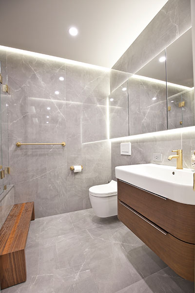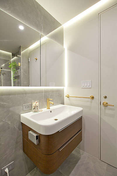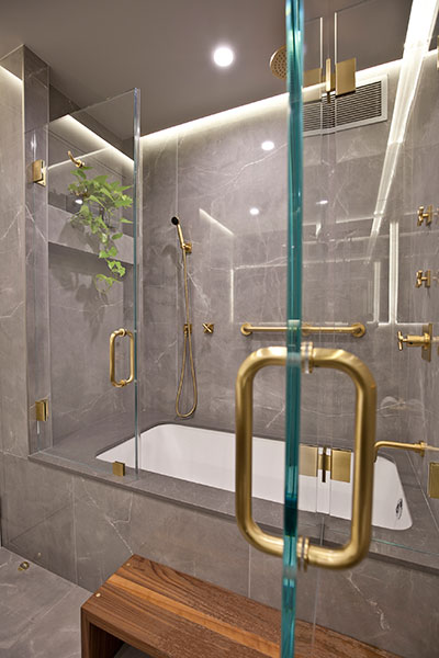 Remembering that a large portion of the apartments in New York have low ceilings, we created a shallow drop ceiling to allow for LED downlights, as well as perimeter LED strip lighting. An oversized medicine cabinet was embedded in the wall to provide needed storage and was illuminated with a separately switched LED strip. All faucets and plumbing valves by California Faucets were custom ordered in a satin-gold finish from Valley Design Central Plumbing supply.”