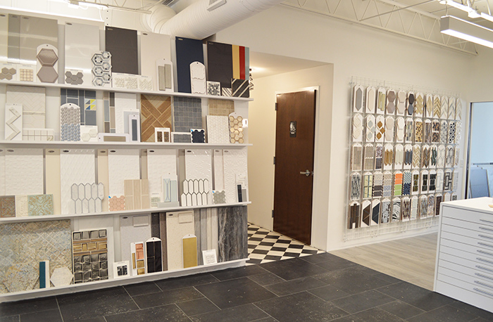 The luxurious, state-of-the-art showroom features multiple vignettes with installed porcelain, natural stone and cement tile in various sizes and layouts for project inspiration. The space, created with architects and designers in mind, has both a design room and a conference room, as well as work tables, a color wall with 130 sample chips, 48 slider panels to showcase the extensive product offerings and much more.