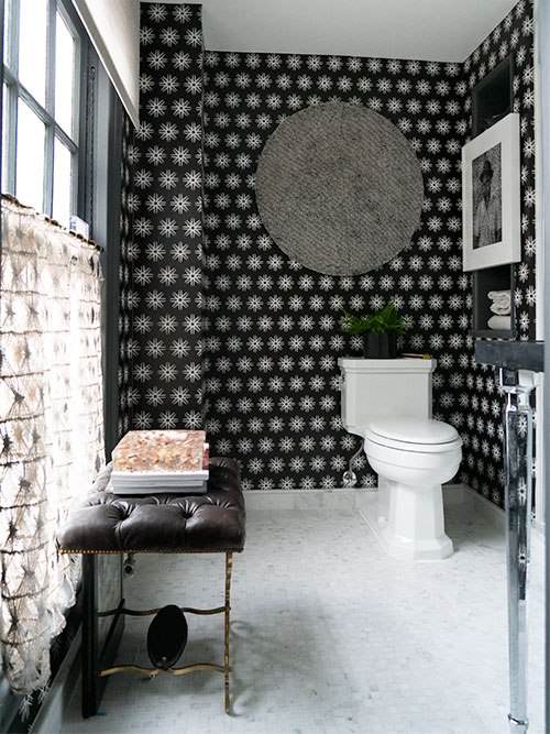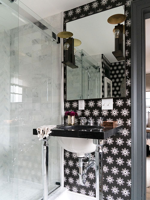 Inspired Materials: “To solve for the tight space above the vanity, we made a simple steel-framed mirror with the sconces set into it; this allowed for the maximum mirror size. The sconces are made of blackened metal with brass reflective hoods. This use of mixed metals adds a vintage feel while still being modern. The stone surfaces on the walls and floor are the same marble but used in different sizes and shapes, bringing in a calm yet interesting vibe. The black-and-white wallpaper is a riff on vintage neckties, and the lace cafe curtain solves for privacy but also adds a bit of softness.” – The Barsanti Desmone team