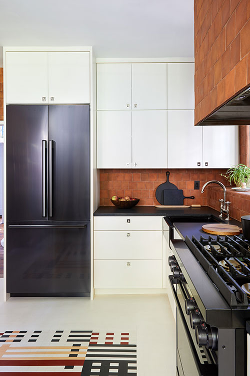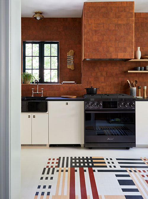 Inspired Materials: “The painted floor pattern is based on an Annie Albers’ textile sketch from the first half of the 20th century, but it feels as new and fresh today as it did then. The dining table by Osvaldo Borsani – whose career spanned from the Deco period into mass-produced modern pieces of the 1960s – blends a traditional decorative style with the clean lines and tapered legs of classic mid-century furniture. We chose an open shelving unit with clear Bauhaus influences to juxtapose with the texture and handmade quality of the terra cotta wall tile directly behind it.” – The Jesse Parris-Lamb design team