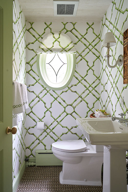 Inside the Powder Room: “The powder room is a place to freshen up, so I used refreshing greens with outdoor vibes and natural materials, like the wall-to-wall sisal carpet and rattan sconces. I still kept a glamorous flair by using the Meg Braff Designs Wallpaper, Kayce Hughes Art and white silk lamp shades.”