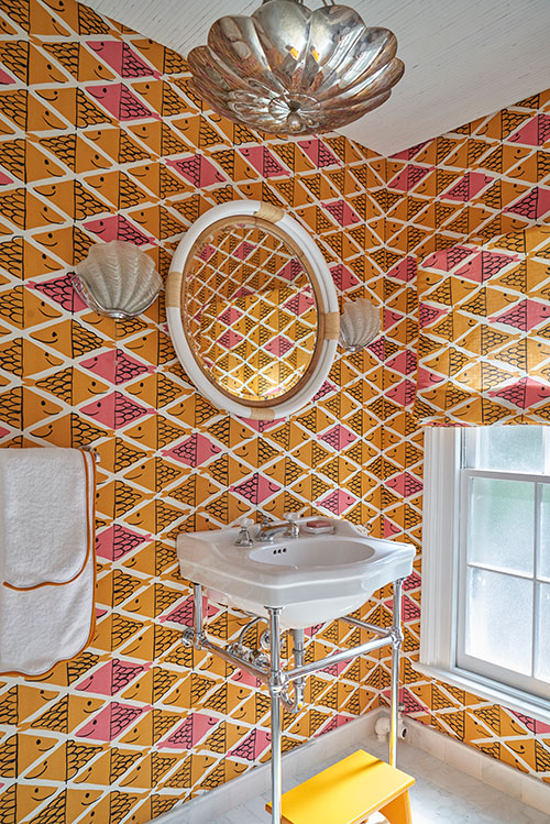 Inside the Kids’ Hall Bath: “The kids’ bathroom also has natural materials, with a bamboo ceiling painted in high-lacquer white gloss. The Art Deco shell sconces and the scallop hanging fixture from Soane Britain tie in an oceanic look with Schumacher fish school wallpaper and a shower curtain that resembles water in an unlikely pink.”