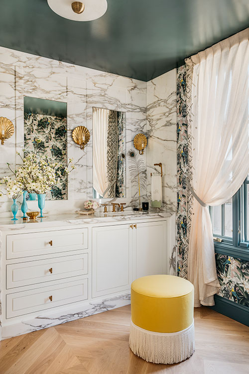 Designer Julie Rootes of Corte Madera, Calif.-based Julie Rootes Interior Design was charged with renovating one of the bathrooms, which she named L’espace Tranquil for its peaceful yet elegant appeal. The space juxtaposes Pierre Frey floral wallcoverings, shell sconces and a marble accent wall for a mix of historical and modern charm. KBB spoke with Rootes to find out more about her design.