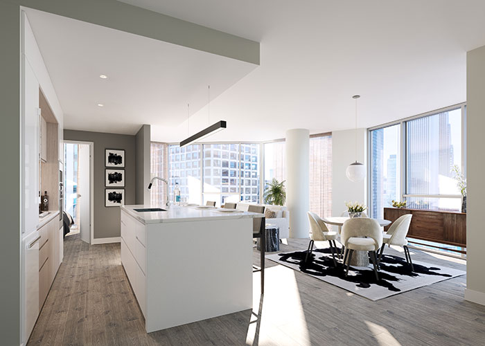 At Cirrus, a 47-story, 363-unit luxury condominium tower in downtown Chicago, buyers can choose from one-, two-, three-, and four-bedroom condos, as well as townhome and penthouse residences. The homes range in size from 650 to over 3,000 square feet and are priced from the mid-$400,000s to over $4 million.