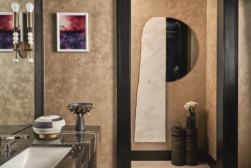 MATERIALS: “I had some great materials to work with, including a stunning Arabescato marble built-in contemporary vanity and a Kohler Purist brass wall-mounted faucet. I also used handmade wallpaper by The Alpha Workshops called Spencer in Bronzed Basalt from the Capsule Collection. It’s a moody backdrop that is also the perfect contrast to Benjamin Moore’s awesome pink First Light 2102-70 on the ceiling. When this color was announced as Benjamin Moore’s Color of the Year 2020, I really felt my pink-themed powder room was meant to be! I built on this luxurious tension with Mitchell Gold + Bob Williams furnishings, including the super funky and fun Poppy swivel chair. The Cleo ombré glass side table is another edgy eclectic piece I love. Handblown pink glass light fixtures by Moshe Bursuker for Evari Studio are the icing on the cake.”