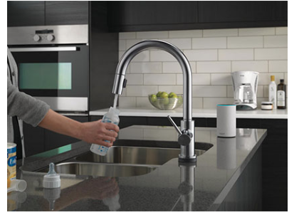 Delta has paired with Amazon’s Alexa to create a voice-activated faucet that doesn’t even require the use of a smart phone app. Available only through Amazon and utilizing its Alexa voice-activated technology, you can “ask” the faucet to activate or shut off or for a precise, measured pour of water. You can also customize individual measured pours that will fill your water bottle, dog’s dish or coffee pot. It still features touch activation when desired.