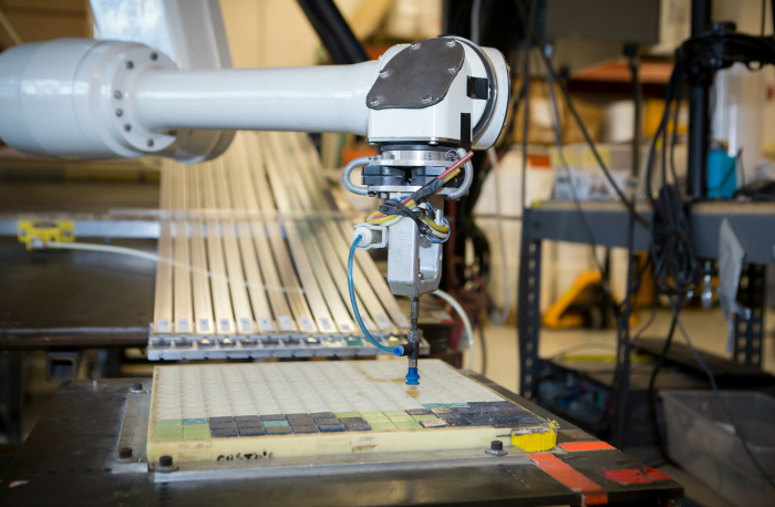 Artaic‘s new facility includes departments for sales and design, production and research and development. The firm’s state-of-the-art gallery/showroom displays the company’s computer-driven, robotically assembled mosaic creations from ceiling to floor in continuous, flowing designs.