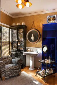 “We chose gilded cork wallpaper as an unexpected background to strong masculine elements, such as a vintage neon clock and dark wood pharmacy cabinet. The wallpaper also helped tie in the original honey-colored wood flooring. We used a modern graphic pattern on an original Art Deco chair and revisited 1930s-style sapphire glass in a mirror, which both opened up the room and became a focal point. These choices provided the sense of old and new.”