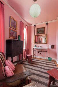 “I’ve been obsessed with pink and brown since I purchased the striped Navajo blanket on the back of the chair, so pink and brown were my springboard color palette. I jumped at the opportunity to create a pink room. I was thrilled to incorporate my favorite period of furniture, as well as the decorative arts made in California in the 1920s and 1930s – including Monterey pieces, Bauer Pottery and artwork depicting places in and around Los Angeles.”