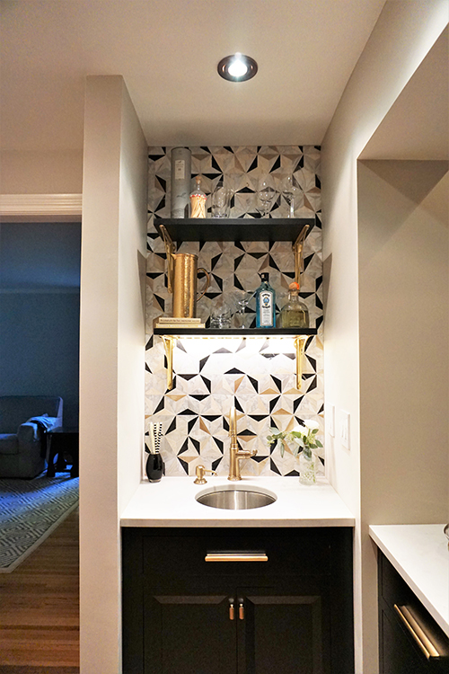 Hutton: “Client requirements included a more cohesive feeling with the rest of the house while being fun, updated and interesting. The homeowner was also in need of functional bar storage, including locking cabinets, plenty of drawers and maintenance-free countertops for easy drink making. My main goal of this project was to pack a punch both in terms of functionality and design in a relatively petite space.”