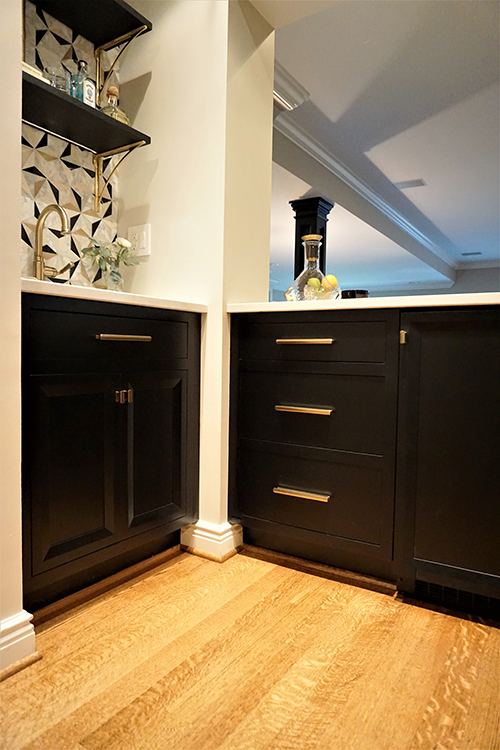 Hutton: “The cabinets, by Masterbrand, are classic and elegant – almost seductive – with a rich, velvety black paint and inset style. The door shape itself is simple and understated, giving way to the deep color. I selected the Caesarstone quartz countertop as it emulates natural marble in color and pattern but has a much longer lifespan than the real deal. With acid from citrus and alcohol, it was vital to have a maintenance-free surface.”