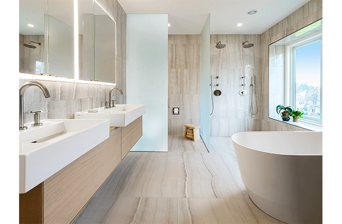 On April 9, 2020, the weather near Weinstein’s family home in Philadelphia abruptly shifted from sunny and calm to a violent windstorm with 70-mph gusts that uprooted a large pine tree that fell directly onto his house. Sunny skies quickly returned, but the sudden storm left behind irreparable damage to the primary bedroom and bathroom, with branches coming through the ceiling of both areas after breaking eight trusses. Weinstein and his family were home at the time, but miraculously no one was injured. Insurance would only cover the structural damage and reinstallation of the original 20-plus-year-old fixtures. When he mentioned to an industry friend from Laufen that the bathroom was destroyed, his friend offered help in the way of new vanities and fixtures.