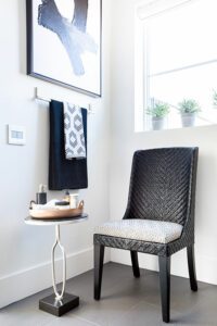 The lighting in the space is automated by Legrand’s Wi-Fi Lighting system, which allows you to control the lights from the home’s iPad or wall switches and program the lights in difference scenes (for example, to light a path from the garage door to the kitchen when you enter).