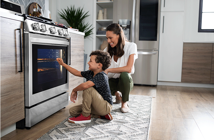 Monogram Statement Series of ranges offers a full collection of appliances with beautiful brass accents. With two ovens below and a total of 8.9 cubic feet of capacity, this range offers ample space to cook for large groups. Plus, the air -ry feature is a great for frozen appetizers and kids’ snacks. For a touch of personal style, LED ring-lit knobs offer custom color LED accent lighting through the SmartHQ app.