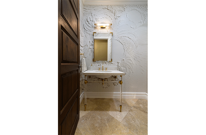 The homeowners wanted to keep the existing natural stone-polished floors, since they run through the rest of the home, which was how the they chose the gold and cream color palette for the powder room. “Powder rooms are small, but this wallpaper made the space a beautiful jewel box,” said Capra. “The 3D-like appearance just really adds so much depth to the room.”