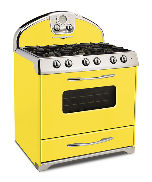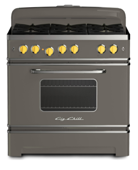 Big Chill: This Pantone-inspired 36-in. Retro Range in quartz gray has broom yellow knobs. Highlights include six burners, stainless-steel construction and an easy-to-clean sealed burner top. The stove is available in natural gas or propane.