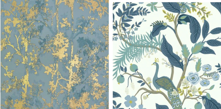 York Wallcoverings: Yellow and gray pair with light blue hues – namely Blue Jean Jacket, which York announced today as its own Color of the Year – to offer a soft, multidimensional look. Options like Shimmering Foliage and Peacock are ideal for updating a home to feel modern yet timeless.