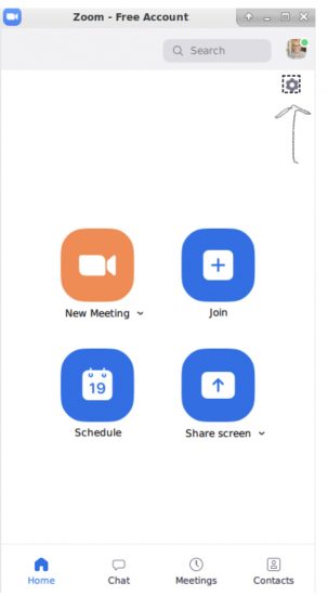 1. Once you have your green screen in place, open Zoom. In the top-right corner, you will see a small gear symbol just under your profile photo.
