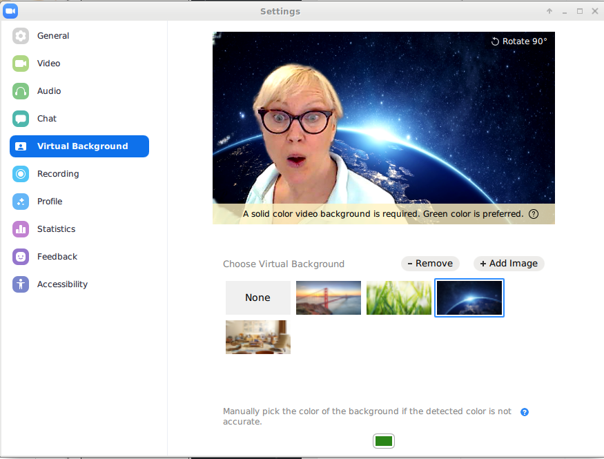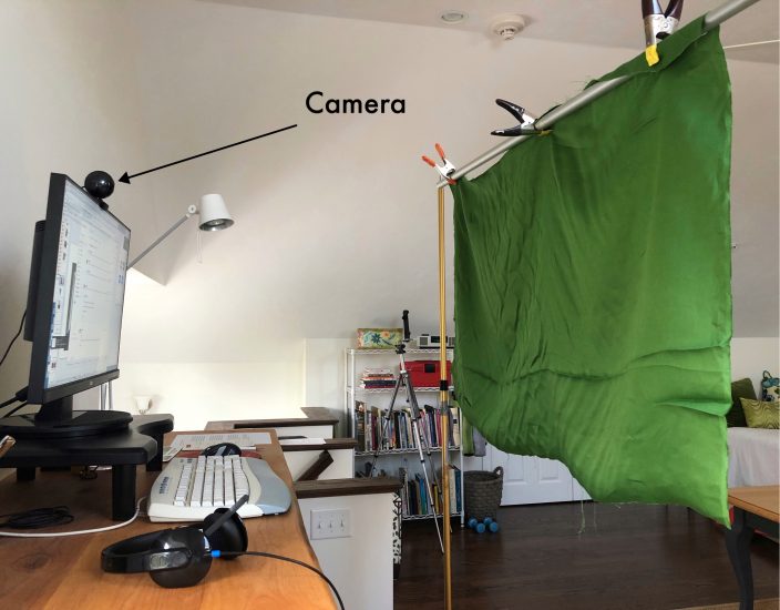 For best results using a virtual background, you are going to need a “green screen.” The photo below shows my actual set up. It’s a remnant piece of green fabric clamped to a photography background stand. You do not need a fancy set up like mine. You can tape green fabric to the wall behind your desk or even use a large piece of green foam core. Side note: Notice my camera is positioned above my monitor so it is pointing slightly downward for more flattering results.