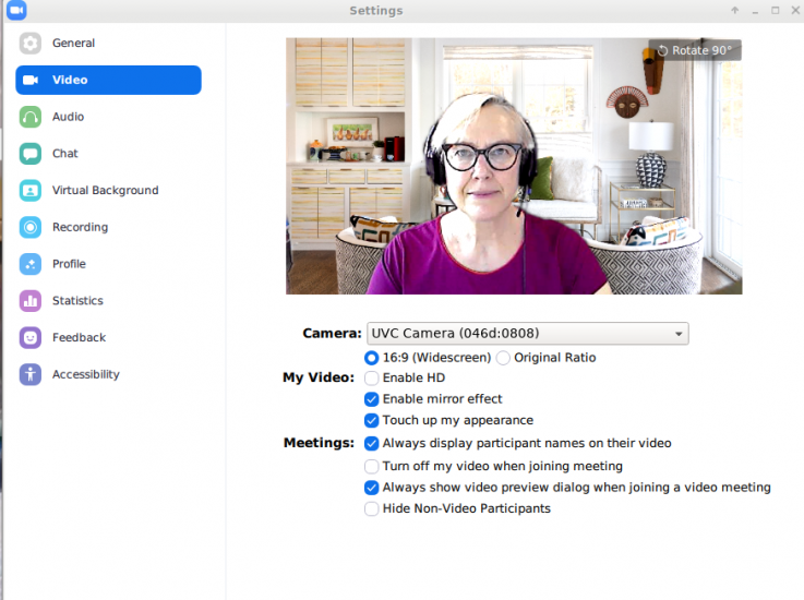 In the image below, a window is behind me. This lighting is not flattering because it is brighter outside than inside. The Zoom light sensor is attempting to expose for the brightest spot, which is outside. On this particular day it was raining. Had it been a bright sunny day, my face would have been be even darker. Okay, I guess I could have smiled, but ignore that and just look at how dark my face is.