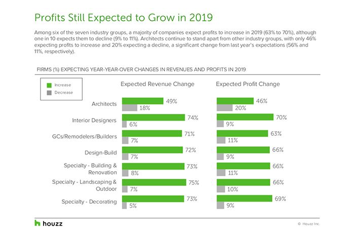 - Optimism prevails for 2019: More than half of residential renovation and design companies cite a positive outlook for 2019 (58 to 80 percent), although this is less than last year (71 to 88 percent). The majority of companies among six of the seven industry groups expect profits to increase in 2019 (63 to 70 percent) and revenue growth in the upper single digits (8 to 9 percent).