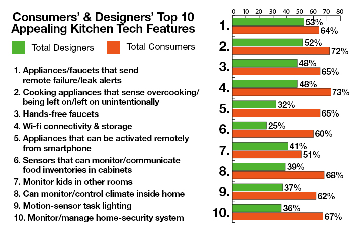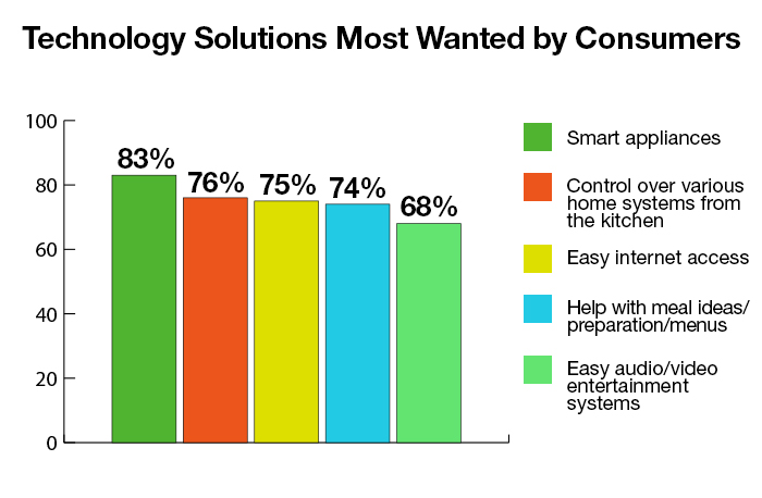 The survey tells us that most consumers use general technology in their kitchens – emailing/texting, using Google and Pinterest to find recipes and creating online grocery lists. If those consumers also knew more about what was available to them, perhaps they would become frequent technology users who could benefit from adding value to the home, saving time, improving the home’s appearance and creating a more comfortable space. Other benefits of adding technology to the kitchen include increased safety, reduced clutter and improved cooking ability.