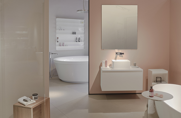 Thanks to the flexible layout and a simplified sequence of spaces that can be reorganized depending on requirements, the showroom is intended to become, even more than before, a place where professionals and clients can meet and exchange ideas. Beginning from five display windows that all have the same scenic backdrop in powder-pink shades, the products are exhibited in a clear and simple way based on an incisive, sophisticated visual communication strategy in which the most recent innovations – such as the WaterCandy handshower – stand out alongside timeless icons that have won prestigious international awards – such as the Lab03 washbasin or the Morphing bathtub.