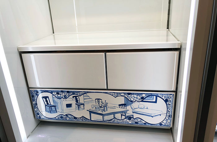 This is the world’s first 30-in. porcelain interior refrigerator. Because of a higher heat capacity than common cooling materials, porcelain minimizes temperature fluctuation and keeps food fresher longer. It also can be customized with hand-painted art on the inside.