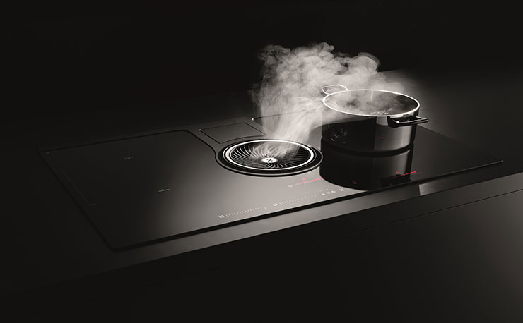 Elica has unveiled its first aspirating induction cooktop, Nikola Tesla. It combines the functionality of the cooktop and hood into one product, eliminating the need for a range hood and providing a clean design aesthetic. This 33-in. smart induction cooktop features sleek black glass and futuristic touch controls, as well as an innovative ventilation system that senses the cooking level of each burner and adjusts the blower accordingly.