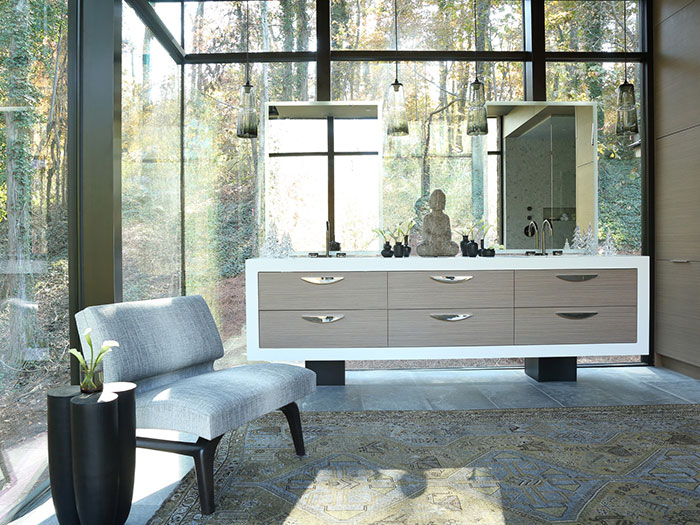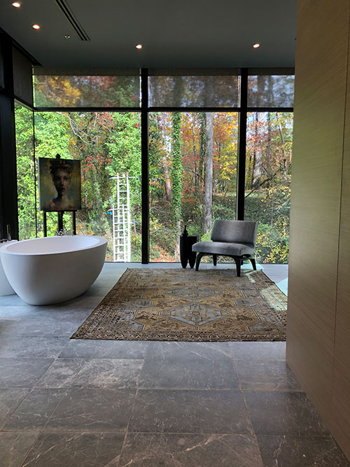 Mills: “This master bath makes you feel like you are floating in the middle of the woods. The cantilever design with glass on three sides makes it the ultimate indoor/outdoor bathroom. My goal was to build off of the overall environment to create a Zen-like, relaxing space.”