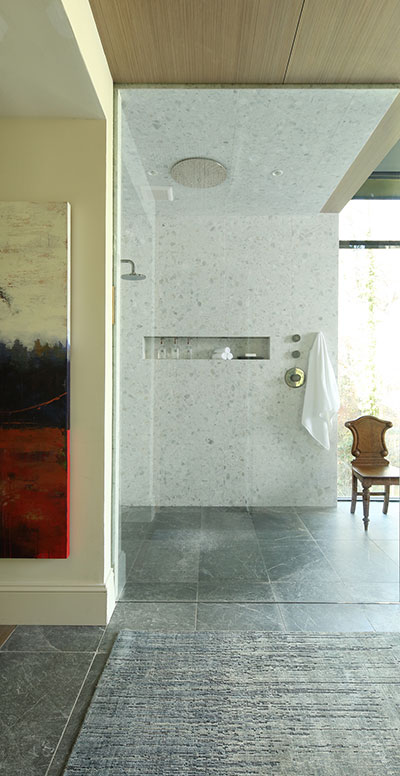 Mills: “Careful consideration went into choosing the right mix of wood to stone. The floors were kept quiet with black iris marble to balance and emphasize the highly organic terrazzo in the shower. The wood-enclosed entry, storage wall and vanity create just enough contrast to the stone to bring both to life. The asymmetrical tub is a subtle nod to the stones in the terrazzo and create just enough conflict with the symmetry in the room to make it stand out. And of course, the waterfall-like ceiling tub filler finish off the Zen experience.”
