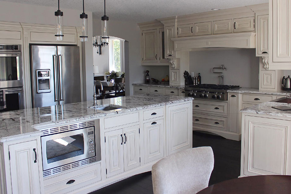 This project is a complete remodel and design, where the kitchen was completely gutted; this included tearing out the corner pantry, removing one window and relocating another. Besides the challenge of dealing with the details regarding electrical, plumbing and framing concerns, the existing bulkhead along the fridge wall was out of place and not deep enough to allow for crown molding to tuck in underneath it. The owners agreed to rebuild it to the dimensions suggested.