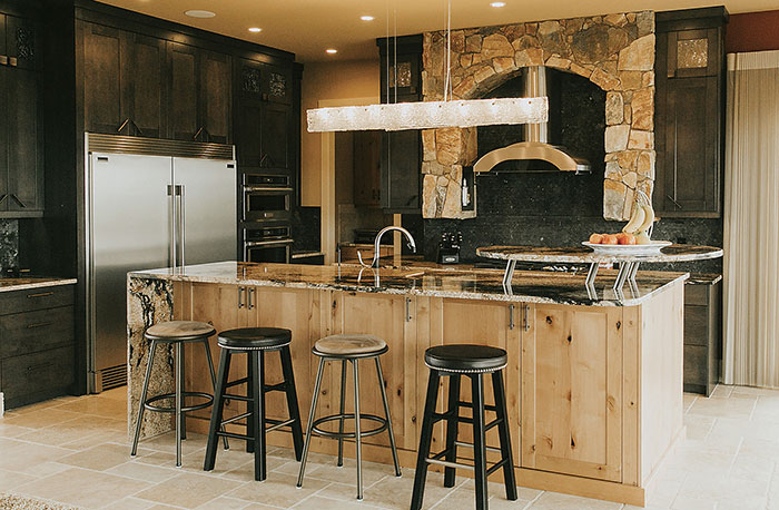 This unique design was heavily influenced by the clients’ immigration from Africa to Canada. African design involves a variety of natural materials, so the design uses a mix of stone, green-tinted brick for the backsplash, unfinished oak wood and frosted glass. Either side of the hood is clad with the rustic stone and creates a dramatic archway reminiscent of African kitchens. The clients also wanted stacked glass cabinets to modernize the rustic look. The island features light wood, which contrasts the dark cabinetry around the perimeter. A sparkling light fixture above the island and a black-and-white countertop add intrigue and character to the space.