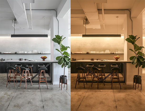 Ketra’s Natural Light slowly transitions from bright and cool in the morning (left) to warm and dim in the evening (right). Ketra is a premium LED lighting system known for making any space feel bathed in sunshine by producing a near-infinite spectrum to mimic the color and intensity of sunlight. Photo Credit: Zio & Sons