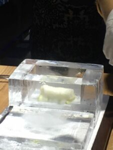 The chefs, which were scattered around the large event space, each showed the journalists the raw fish sitting inside the ice, which was then covered with a top and placed in the oven for nine minutes. After that time, they took out the perfectly intact ice, removed the top and revealed a steaming hot, thoroughly cooked fish fillet.
