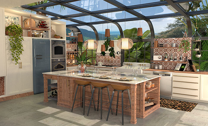 The second-place winner is Samantha Kragel of Iowa State University. The 2019 Colormix Forecast palette Wanderer served as the direct inspiration for Kragel’s project. The moment Samantha saw this palette, she began to visualize the style and mood of the project. Samantha could see this home belonging to a gatherer – someone who travels the world and collects treasures along their way. They have a free spirit, a love for botanical environments and are not afraid of bold color and pattern.