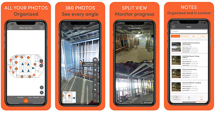 HoloBuilder organizes its 360-degree progress photos by location and time, while also allowing you to share images and information with clients and contractors. You can also download and create documents of the records.