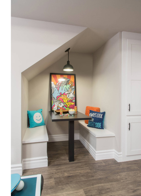 The designer made use of space underneath the stairs, creating a study/game/craft nook. Photo Credit: Liston Design Build