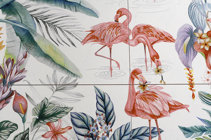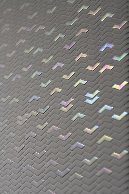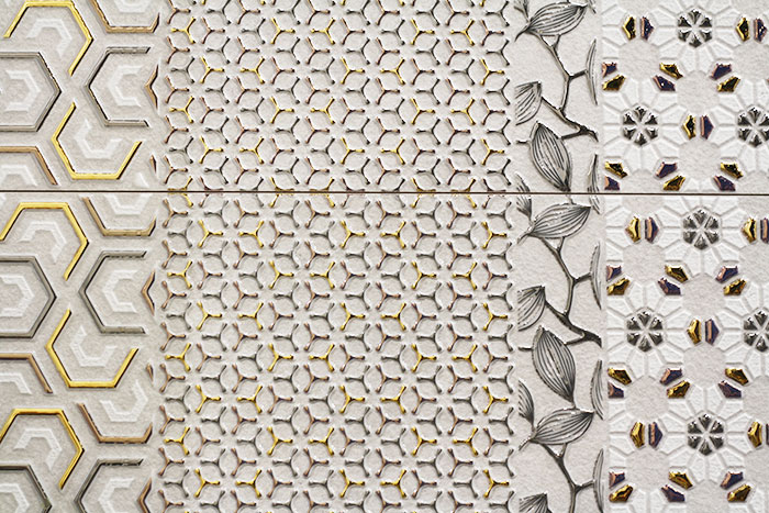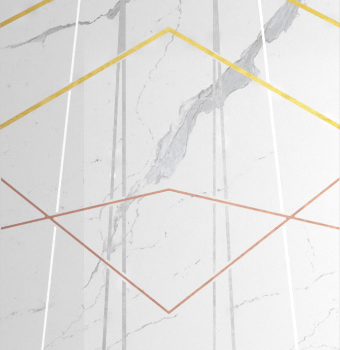 Closely replicating natural materials is only the start for manufacturers like Bestille, which uses three different effects in one piece. In Bestille’s White Flamingo, there is an underlayer of silvery luster ink, a glossy color that establishes the design and metallic touches over the top. Apavisma’s Natura Collection similarly imitates marble on the base layer and overlays it with gold and silver geometric lines.