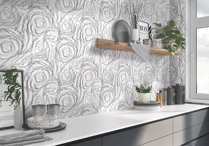 From intricate veining patterns to warm golds and cool silvers, the desire to indulge in eye-catching ceramics is trending. Large-format slabs with smoky marbled streaks combine with the soft shimmers of iridescent details to create glamorous interiors.