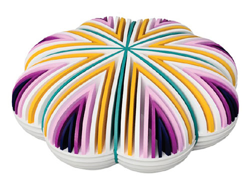 Thompson received $1,000 for her “ke-li-de-skop” chair, named after the pronunciation of kaleidoscope, the classic toy that allows users to look inside and see small bits of color change shape as the instrument is turned around. The chair’s design, comfortable shape and inviting colors – including navy blue, chrome yellow and eggplant – add to its appeal. Thompson returns to the roster of FORM winners, having been named first-prize winner in 2018. She is a student at Kean University in Union, N.J.