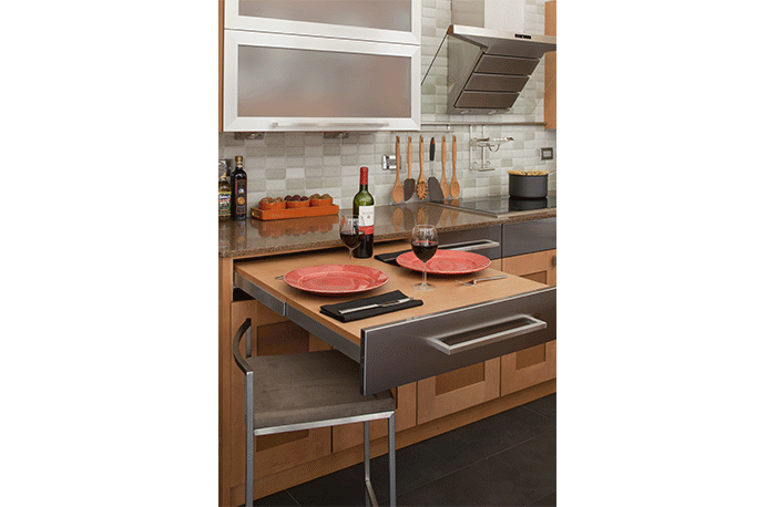Häfele’s Pullout Table Fitting Top Flex hardware set is made of plated steel and can hold up to 66 pounds. It extends up to 32 inches and works with cabinets between 17 ¾ and 35 ½ inches in width. As the table is extended, the front panel drops down automatically until the top is flush with the table. Price is $650 per hardware set. www.hafele.com
