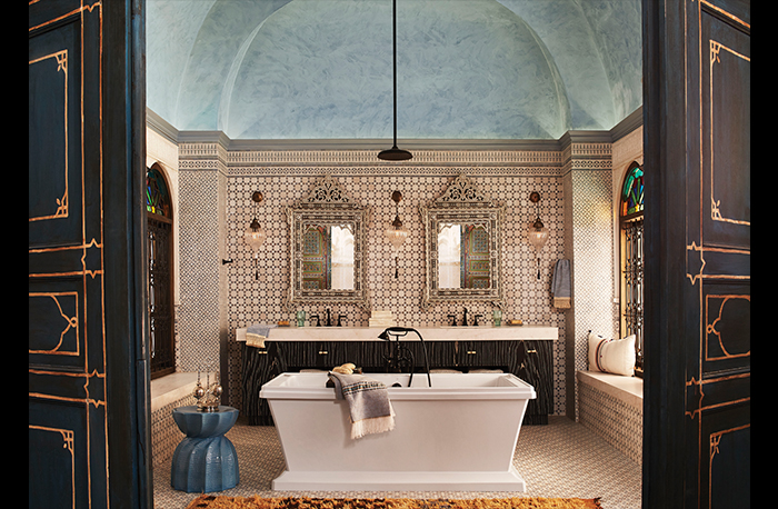 Curtis created a serene Casablanca bathroom appropriately based upon a Hamman, a steam bath similar to a Turkish bath. The Fitzgerald freestanding soaking tub is a fixture from the DXV Golden Era movement, inspired by a time when the handcrafted blended with the modern.
