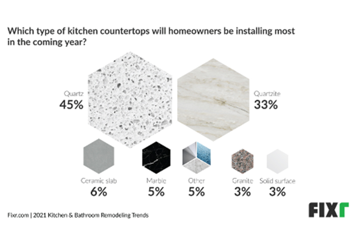 When it comes to countertops, there’s a wide range of possibilities among color, textures and finishes. It’s always a good idea to keep in mind the durability and practicality of the material chosen, too. According to 45% of the experts, quartz will be the top choice for kitchen countertops in 2021, closely followed by quartzite with 33% of the vote. Both materials are a great option for countertops and will provide you with different benefits. Quartz is highly resistant to stains and scratches while being an easy-to-clean surface that requires almost no maintenance. Quartzite is especially durable and has really interesting colors and unique vein patterns.