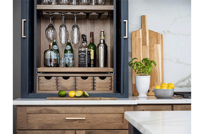 “With Dura Supreme’s larder units, even those small appliances can be housed neatly and discreetly behind beautiful cabinetry,” explains Karen Wistrom, vice president of marketing for Dura Supreme Cabinetry. “A Beverage Center Larder Cabinet (below) can be a highly functioning coffee station or house a complete home bar setup, while a Storage Center Larder can be used as a breakfast station to make mornings a breeze. A Baking Center Larder can be used to keep baking prep and cleanups to a minimum.”