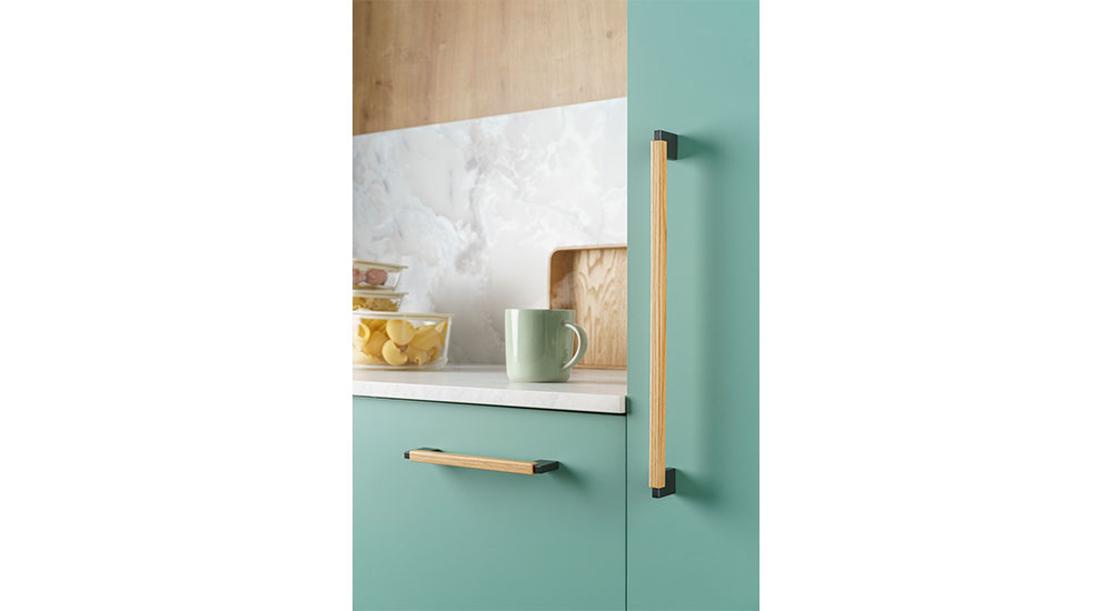 Duo (shown below) is a warm, Nordic-style handle with a good grip. Linear and free of superfluous details, the aluminum base and wooden handle create a balanced duo perfectly suited to modern spaces imbued with tranquility. Created by German designer, Ilja Huber, it is ideal for offices and contract projects. It goes perfectly with kitchen appliances, where it can be applied vertically or horizontally, while combining different dimensions to produce more dynamic settings. Made of certified wood.